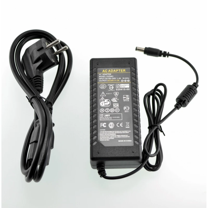 Kompatibilitás: Ez a tápegység kompatibilis a legtöbb olyan LED szalaggal és LCD/LED monitorral, amelyek 24V bemenetet és legfeljebb 3A áramerősséget igényelnek, amennyiben 5,5mm külső átmérőjű és 2,5mm belső átmérőjű csatlakozót használnak.