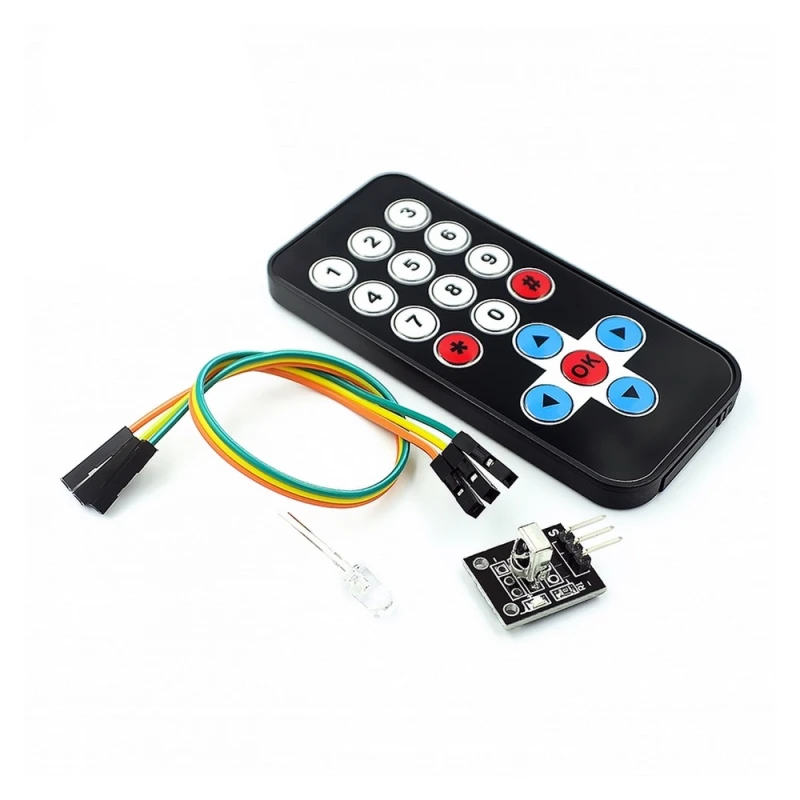A készlet tartalmaz egy ultravékony infravörös távirányítót (CR2025 elemmel működik) és egy 38 kHz-es infravörös vevőmodult. A távirányító mérete körülbelül 86 mm x 40 mm x 7 mm, a vevőé pedig jellemzően 17 mm x 10 mm x 7 mm, bár a gyártótól függően enyhén eltérhet.
