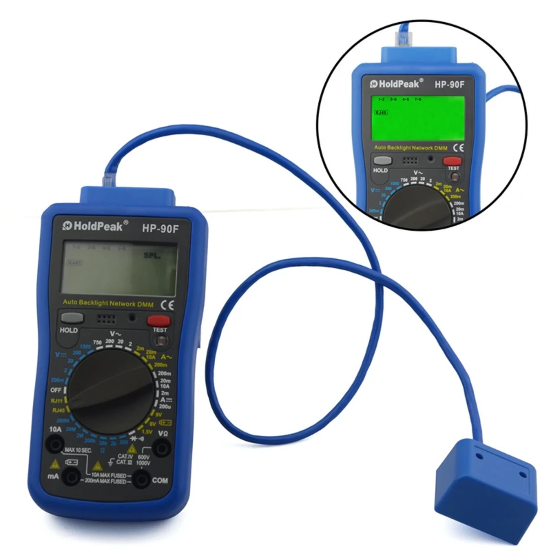 HoldPeak HP-90F digitális multiméter RJ11 és RJ45 kábelteszttel