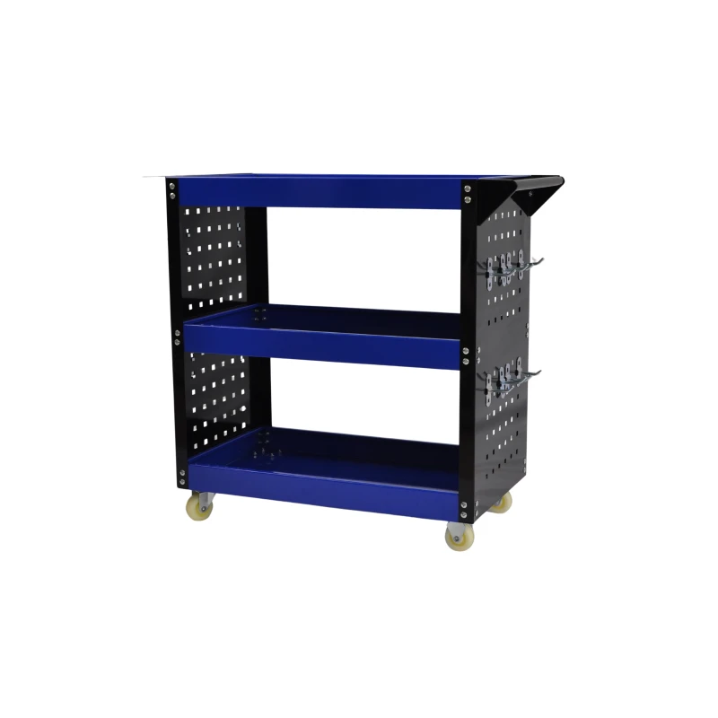 Rendszerezze munkaterületét ezzel a 3 polcos professzionális műhelykocsival, egy továbbfejlesztett változattal, amely perforált fém oldaltálcákat is tartalmaz, hogy nagyobb stabilitást és több hasznos felületet biztosítson a szerszámok számára. A kék és fekete színkombinációnak, valamint a masszív kialakításnak köszönhetően praktikus és funkcionális megoldás műhelyekbe, garázsokba, karbantartási szolgáltatásokhoz és igényes barkácsolóknak.